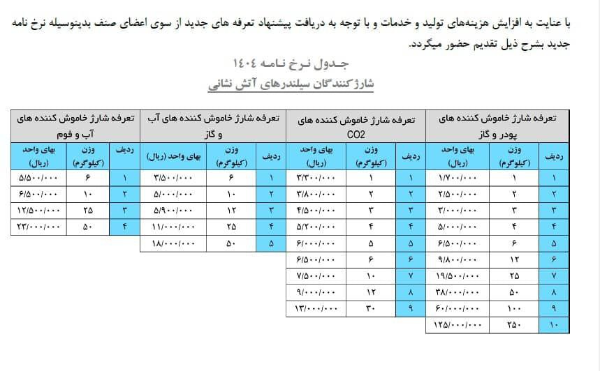 لیست قیمت شارژ خاموش کنندههای آتش نشانی (کپسول های آب و فوم) سال 1404